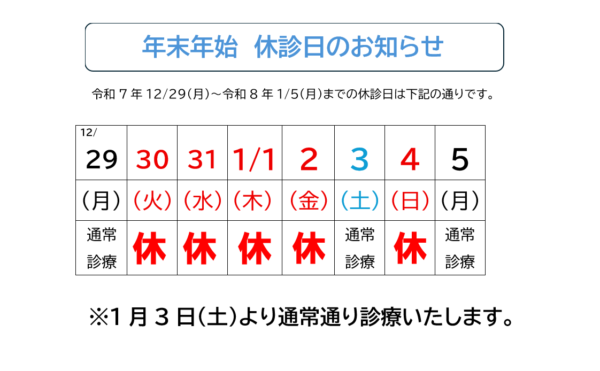 令和7年12/29(月)~令和8年1/5(月)までのお休みは下記の通りです!! 12/29(月) 通常通り 12/30(火) お休み 12/31(水) お休み 1/1(木) お休み 1/2(金 […]