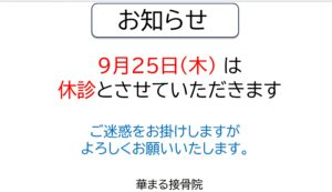 2025年10月2日 / 最終更新日 : 2025年10月2日 news お知らせ 10月のお休みのお知らせ 今月のお休みは、 1日、5日、8日、12日 13日、15日、19日 22日、26日、29日 です!! この時期は、寒暖差が激しいので体調を崩しやすくなり、肩こりや腰痛が起きやすいので身体を冷やさないようにお気を付けてください❗ 交通事故治療認定院華まる接骨院
