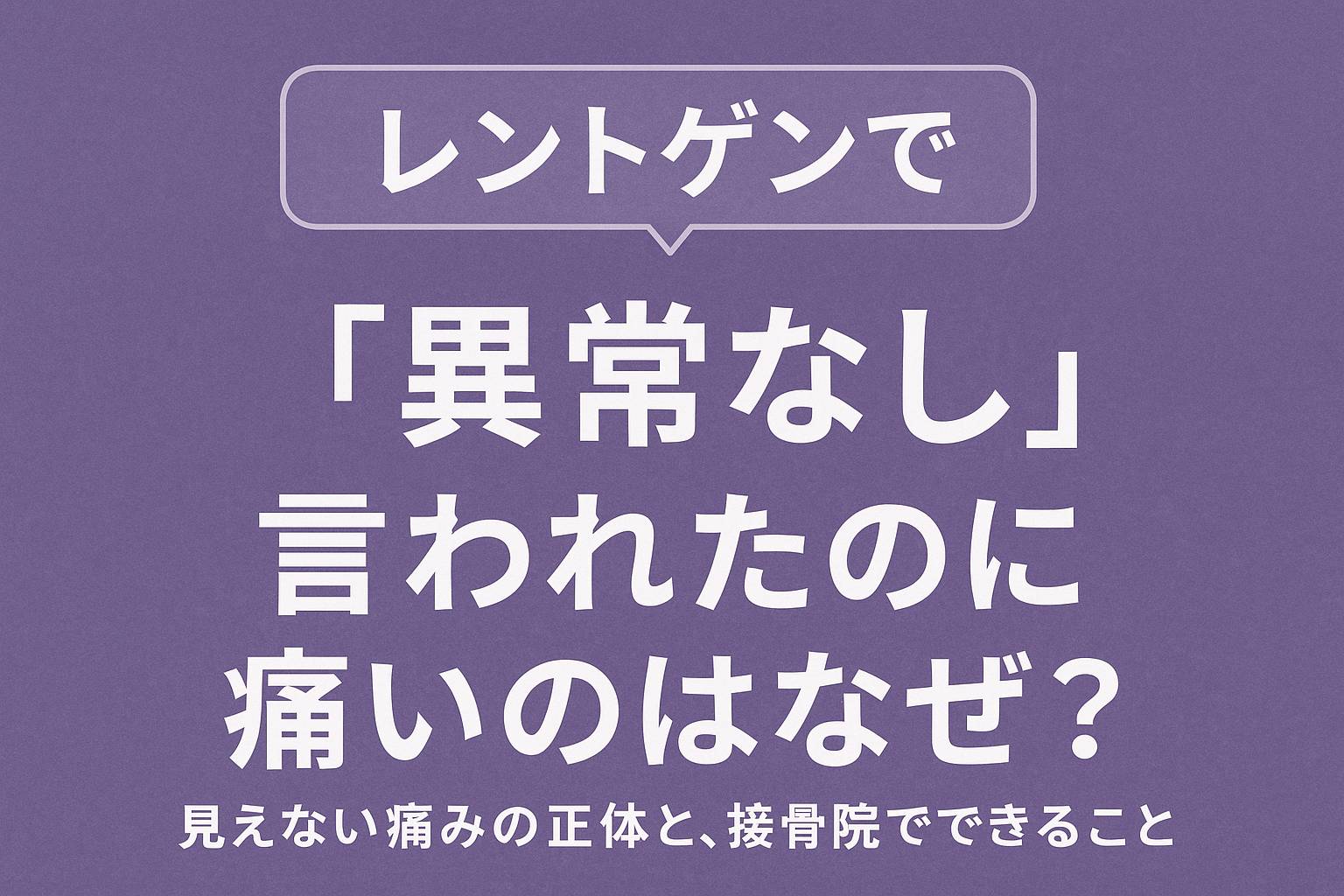 2025年11月14日 / 最終更新日 : 2025年11月14日 news お知らせ レントゲンで「異常なし」と言われたのに痛いのはなぜ? 〜見えない痛みの正体と、接骨院、整骨院でできること〜 はじめに:検査では「異常なし」なのに、なぜ痛い? 「病院で検査を受けたけど、“異常なし”と言われた。だけど、首や腰の痛みが続いている…」 […]